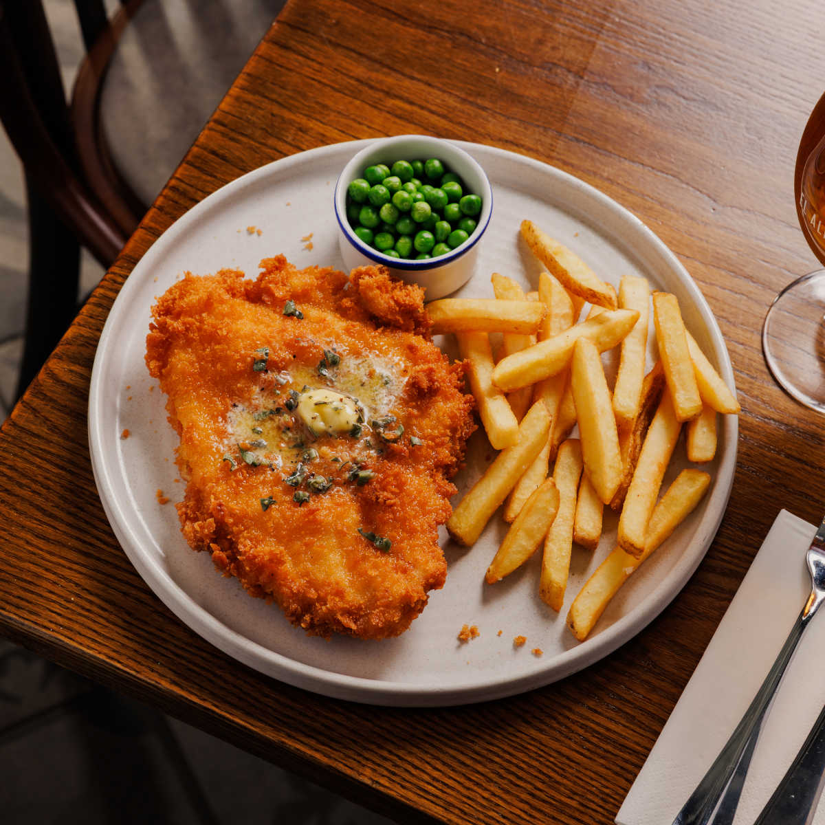 Crispy chicken schnitzel, breaded chicken topped with garlic butter, with chips and garden peas | 13.99 1364 kcals